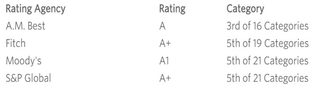 Transamerica还获得了贝氏(A. M. Best),惠誉(Fitch),穆迪(Moody's)和标准普尔(Standard & Poor's)等四大主流信用评级机构A级以上好评。