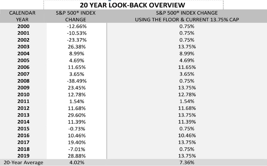 以S&P500指数策略为例,过往20年平均收益率为7.36%,保证收益是0.75/年,最高收益是13.75%/年,稳健平衡策略。