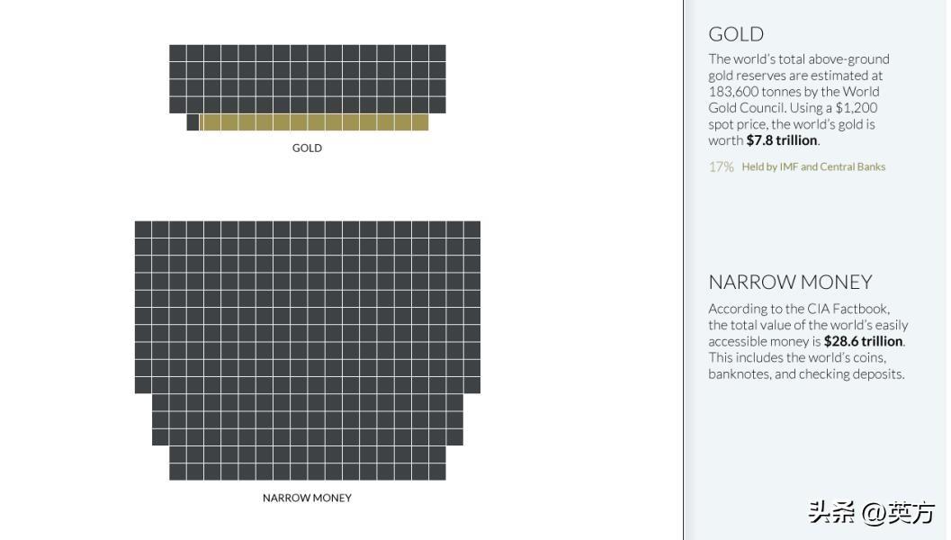 根据CIA报告,全世界可交易货币价值大概28.6万亿美元。这包括全世界的银币,纸币以及存款。