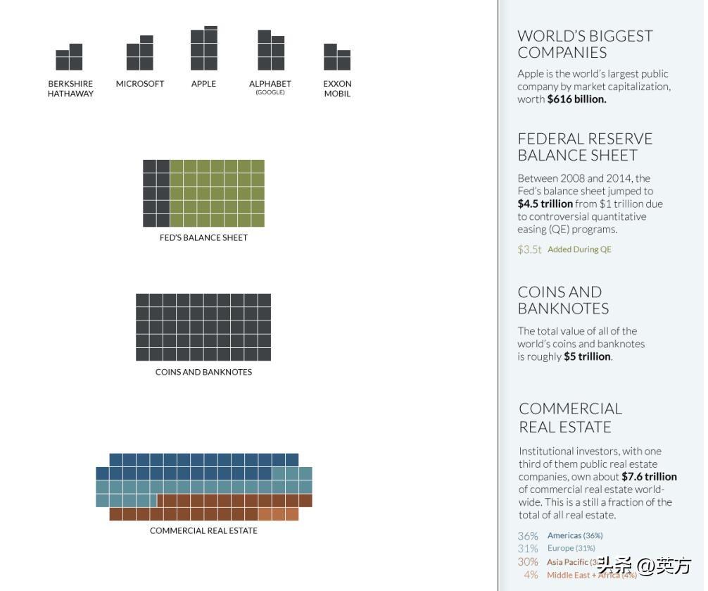 对于大家来说这是一个足够陌生且有多重答案的问题,现存钱的数量的变化完全取决于我们如何来定义它。我们使用更多的抽象概念来定义这些钱,钱的数字存量就更高。在这幅世界货币供应总量的可视化数据中,我们不仅仅是比较不同货币定义,还要展示各种不同信息的背后隐含的力量。这些就是为什么也要加入可了解的分支比如世界上最富有人群的财富,大型公共贸易公司的市场资本化,所有股票市场价值,以及全球债务总数。