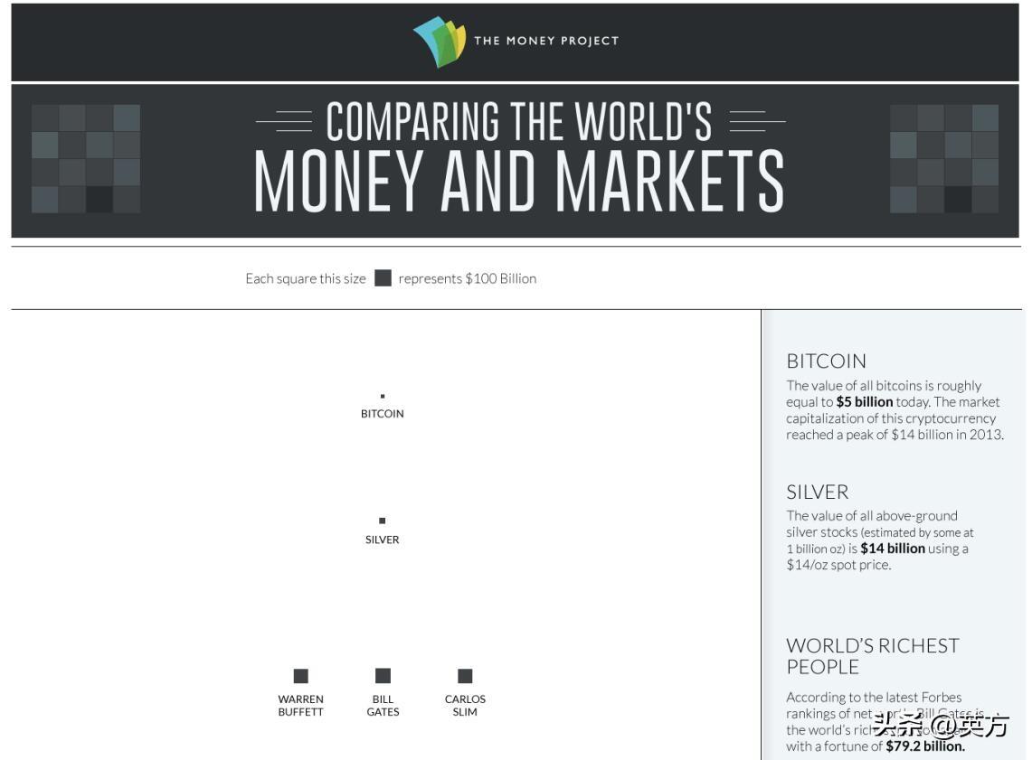最终的结论是一个阶梯式的资讯内容,其包含那些最小的市场(比特币=50亿美元,以银作为计量单位的股票 = 140亿美元)到世界上最大的市场(衍生品市场)。在这些世界货币的分支,都是以如何定义来确定的。这些包括全球硬币以及纸币(5万亿美元)供应,黄金供应(7.8万亿美元),狭义货币供应(28.6万亿美元),以及广义货币供应(80.9万亿美元)。