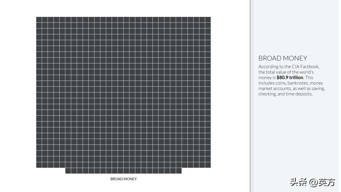 根据CIA报告全世界货币总价值80.9万亿美元。这包含硬币,纸币,市场账户,比如储蓄,存款以及定存等等。