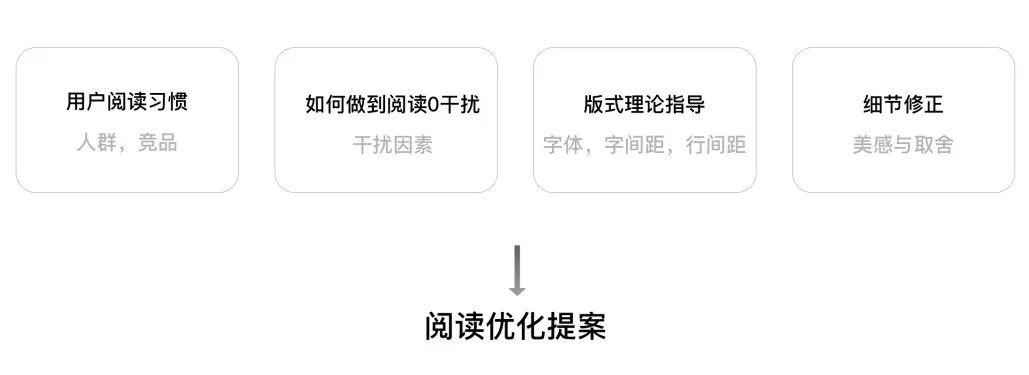 聚焦用户(用户阅读习惯探索,主要从人群和竞品方面研究)——明确目标(什么叫沉浸阅读,如何做到阅读0干扰)——理论指导(成熟的版式理论推出屏幕理论,指导优化)——细节修正(落地操作,沉淀)