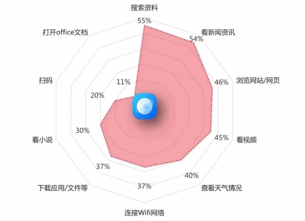 浏览器用户最重要使用行为主要是搜索,其次是新闻。