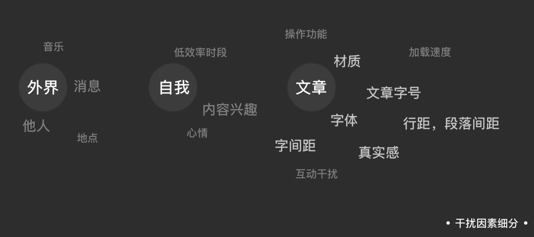 上图中我们对干扰阅读的因素进行了细分,一共三个大模块:外界,自我,和文章本身,我们设计师能加以优化的点都和文章本身相关(文字字号,字体,字间距,真实感,行距,段落间距,页面材质等)。