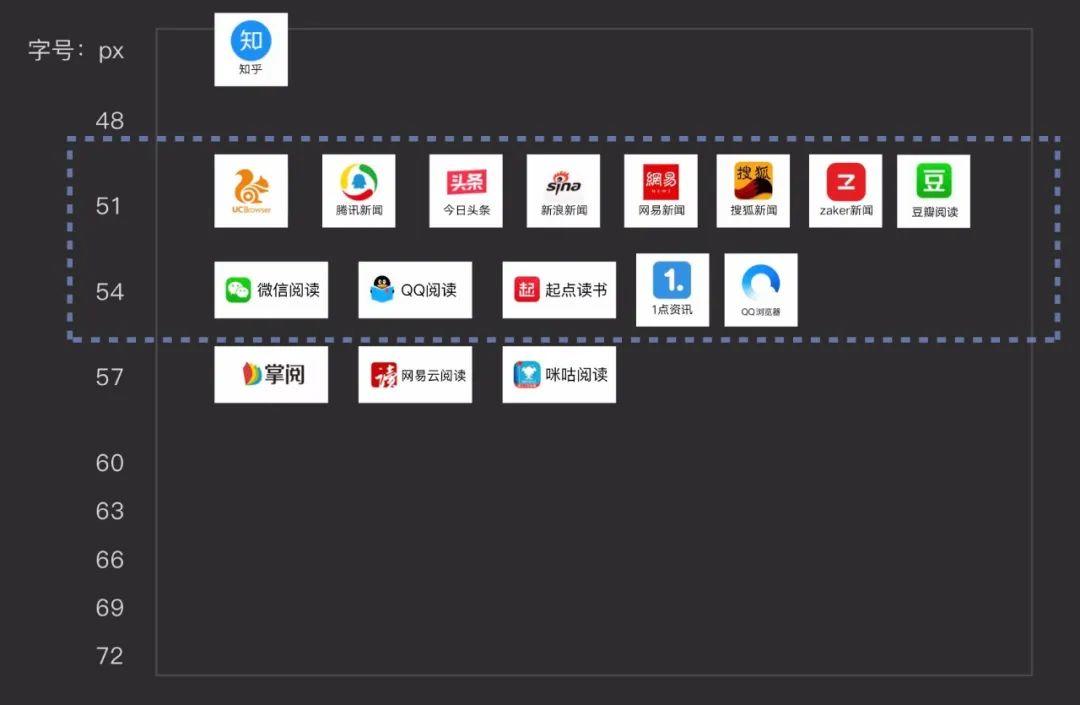 正文:大部分阅读器APP字号比新闻资讯类APP大一些,资讯类字号选在51最为合适,54也可以考虑。