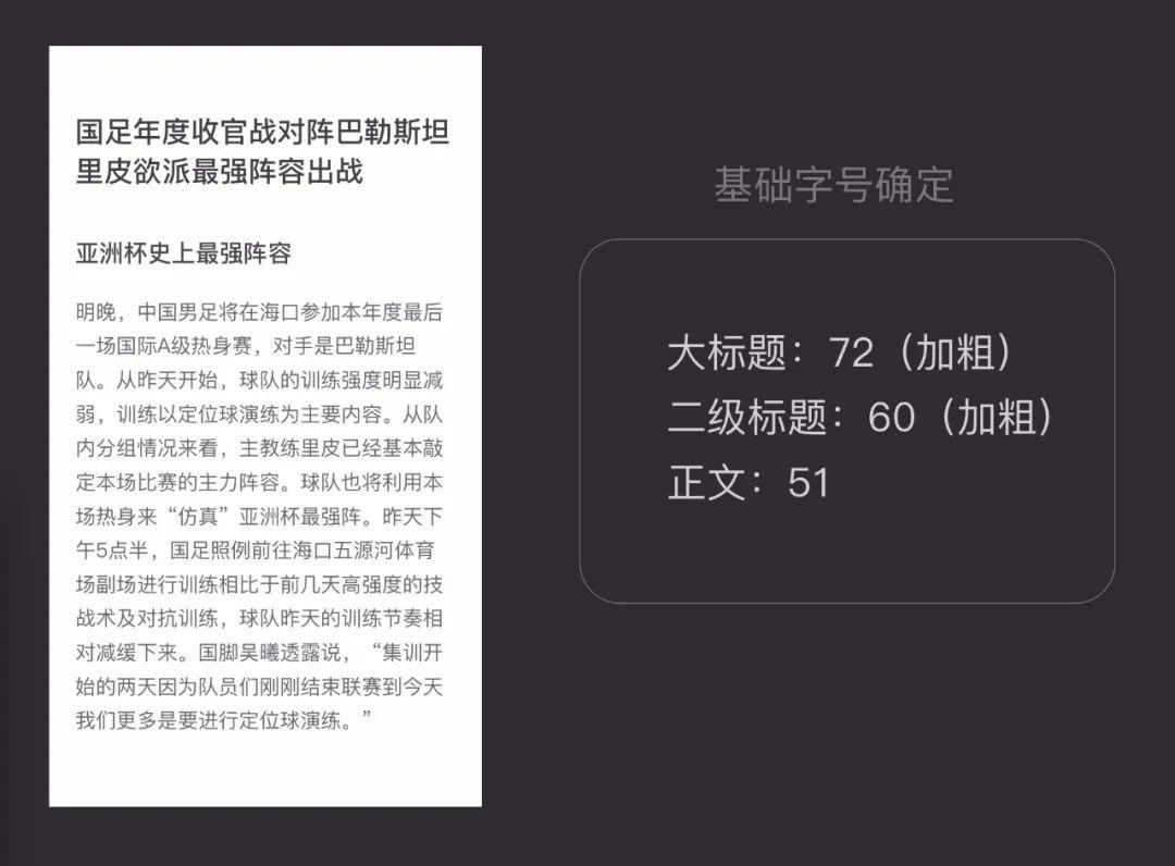 为了明显让用户感知到字号差异带来的文字功能差异,加快识别反应速度,三个功能各字号不能过于接近。最终定义为大标题72px,二级标题60px,正文51px,且标题加粗显示(如下图)。