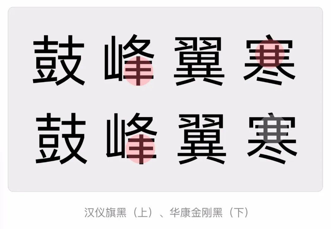 汉仪旗黑(旧字体):字形扁正,转折处复杂。存在问题:扁正的字体缺少精神气,转折处复杂会影响单个字体的理解速度,降低整篇文章的阅读速度。