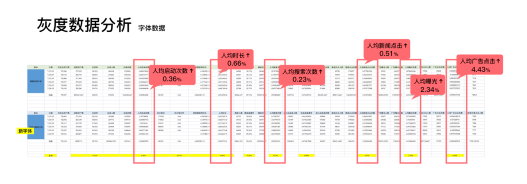 报告里看出在较短时间的灰度测试中仅仅字体变化,其他都不改变,关键业务指标都有正向提升:人均启动次数,人均新闻点击,人均时长,广告点击等都有正向数据提升。