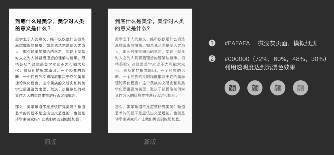 文字沉浸:用色方式上再做考究,降低颜色饱和,解决文字黑色块的视觉干扰。文字做透明度来模拟沉浸效果。