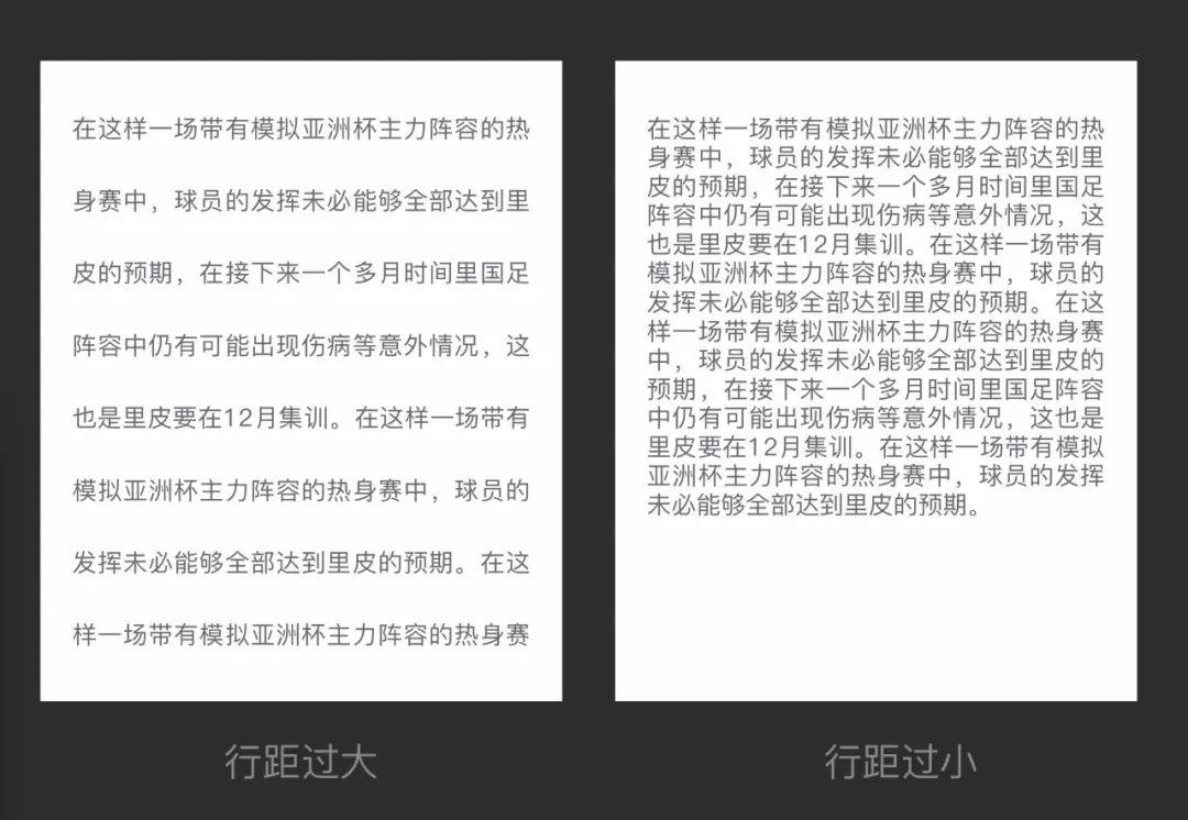 行距过大会打破文本连续性,每一行会被孤立,缺乏紧凑感,会降慢阅读速度。行距太小会让页面灰度过重,读者眼睛承受过多的负担,无法集中阅读单独一行,时间久了会增加疲劳感。