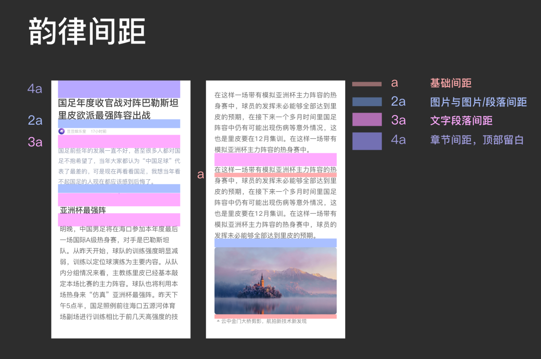 聚焦用户的习惯之后,我对阅读要素:字号,字体,对齐,用色,留白规律分别进行研究,结合各个相关理论沉淀出适合新闻阅读的规范。