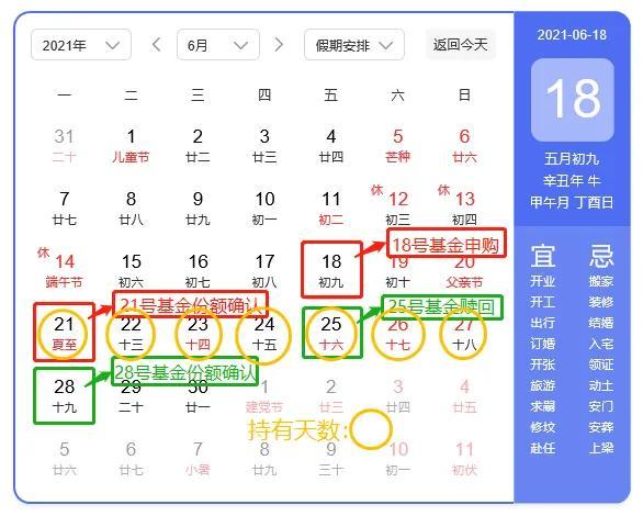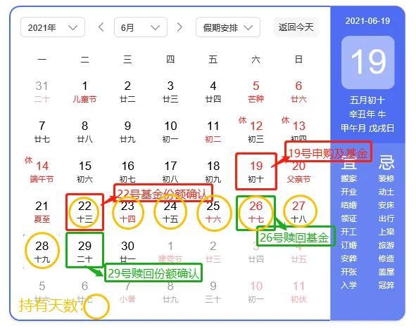 例子2:2021年6月19日15点前申购一只T+1确认的基金,2020年6月26日15点前赎回,基金持有时间是多少天呢?