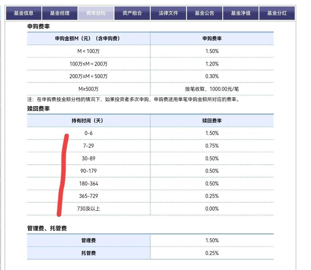 可以看到不同的持有时间赎回费是不一样的,如果持有天数在7天以内,需要支付1.5%的赎回费。当然其他基金也基本遵循这个原则。