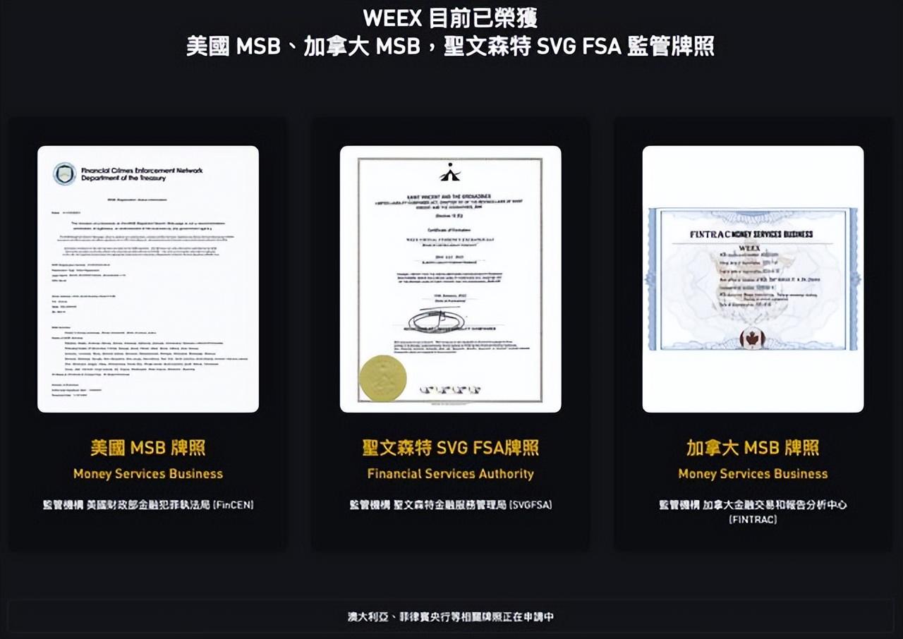 首先,weex交易所说,自己遵循严格的合规标准,并持有合法的运营许可证,用户可以通过访问WEEX官网查找相关许可证和合规声明。WEEX交易所持有美国MSB、加拿大MSB、圣文森特和格林纳丁斯(SVG)FSA金融监管牌照,澳大利亚、菲律宾央行等相关牌照正在申请中。