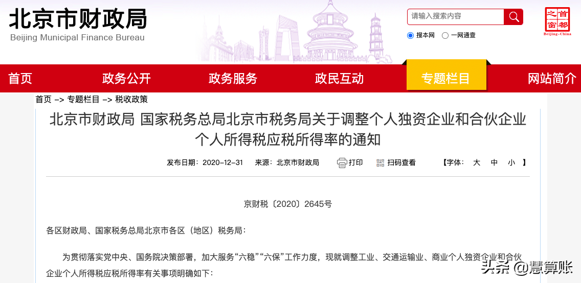 北京发布调整个人独资企业和合伙企业个人所得税应税所得率的通知,文件中明确:自2021年1月1日起,实行核定应税所得率征收方式的工业、交通运输业、商业个人独资企业和合伙企业,应税所得率按5%标准执行。较之前下调了2个百分点。