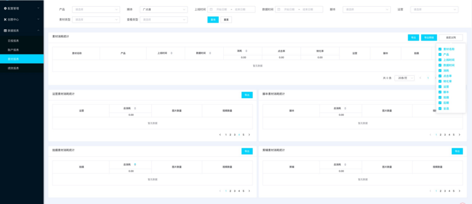“云天智投RPA素材报表功能上线,可以实现跨账户产品层级素材消耗统计数据报表上线,支持自定义列查看单个素材的消耗、点击、转化率,数据报表支持导出。并支持自定义查看素材数据、分人员、分岗位查看素材消耗数据。”