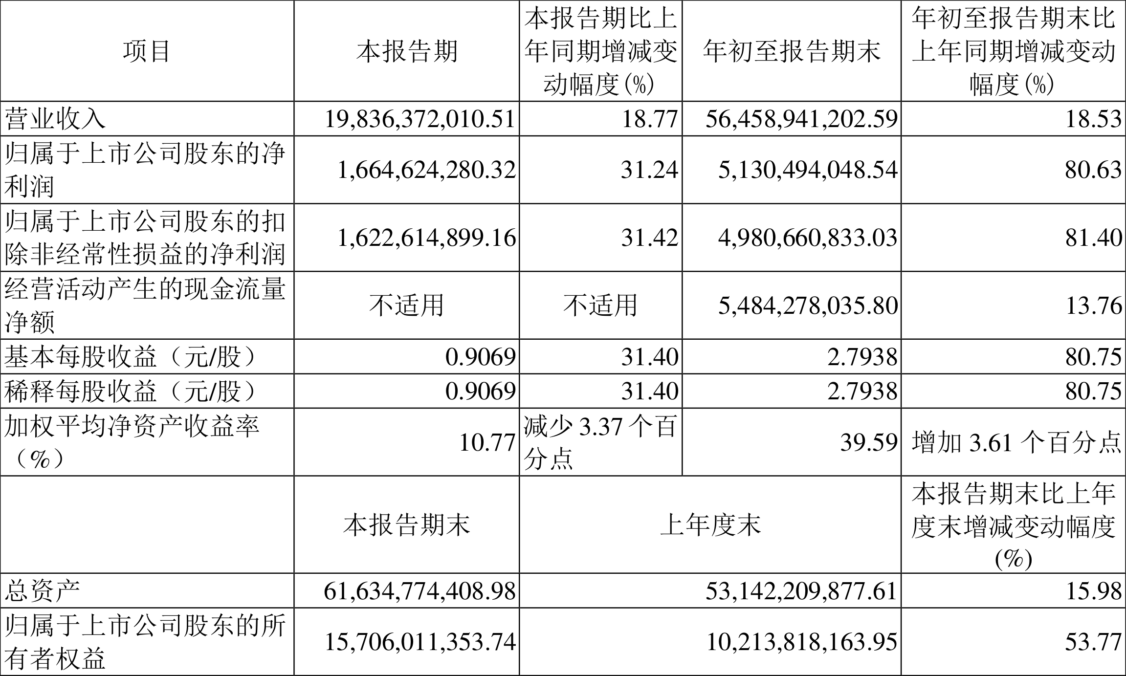 根据三季报,公司第三季度实现营业总收入198.36亿元,同比增长18.77%,环比下降8.42%;归母净利润16.65亿元,同比增长31.24%,环比下降8.55%;扣非净利润16.23亿元,同比增长31.42%,环比下降8.09%。