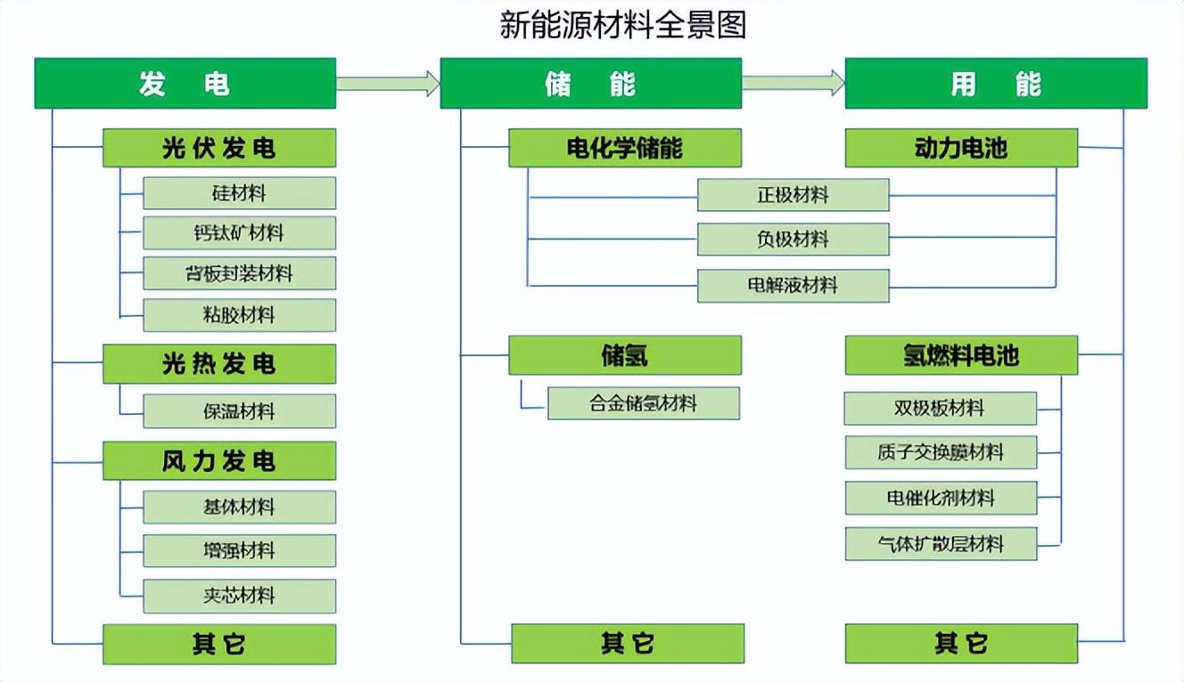 从发电端来讲,目前应用比较多的就是光伏发电、光热发电、风力发电。而在储能端,主要应用就是电化学储能、电解氢储能,还有一些物理储能方式,在用电端,主要的应用就是动力电池,还有氢燃料电池等。而这些应用,都涉及到一些关键的材料,