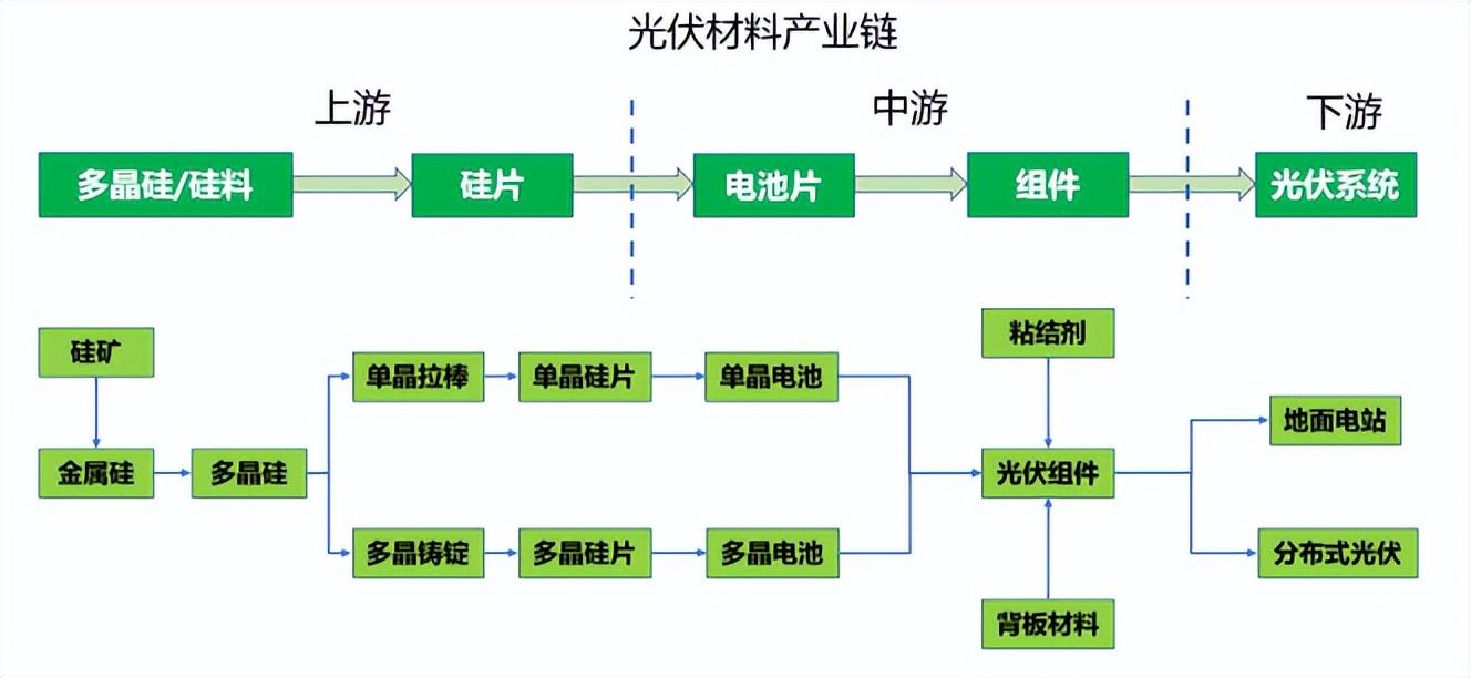 虽然光伏发电系统的组成材料各异,但所有的组件都包括若干层从向光面到背光面的材料。光伏原材料的最上游是硅矿,从硅矿到金属硅再到多晶硅几个环节共同构成光伏产业链最上游的环节。