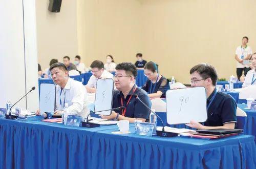 在智能装备路演现场,农业农村部南京农业机械化研究所副所长曹光乔(右)、新希望集团首席投资官余峰(中)、艾格资本董事长黄德钧(左)三位评委专家为路演项目打分。