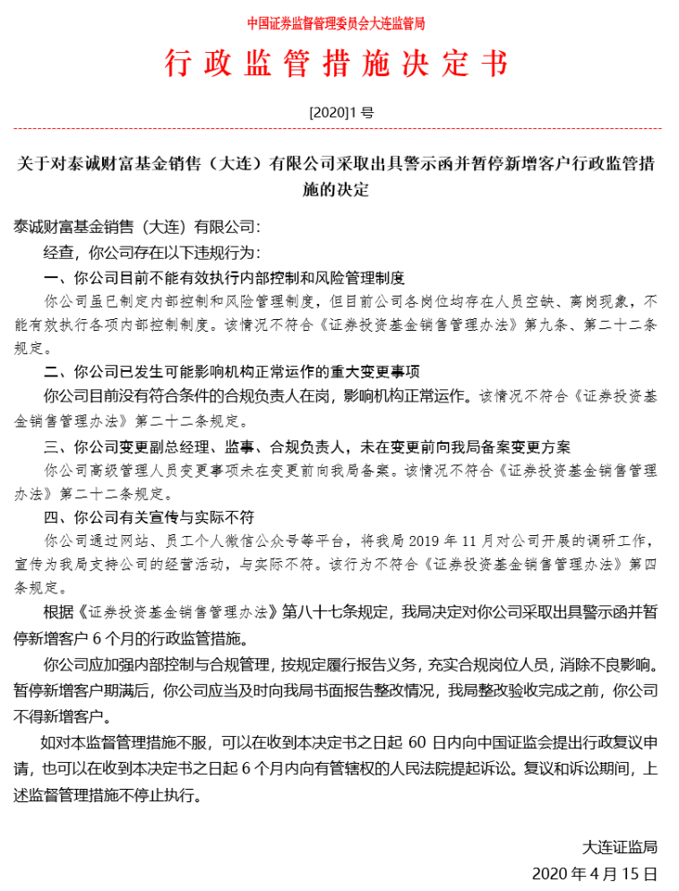 2020年4月16日,大连证监局发布《关于对泰诚财富基金销售(大连)有限公司采取出具警示函并暂停新增客户行政监管措施的决定》。《决定》中列举了泰诚财富多项违规行为: