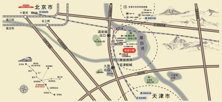 恒大花溪小镇择址具有“高铁新城”之称的宝坻京津新城,临近京滨城际宝坻南站,城际直达北京、天津、唐山;周边以京津、京哈等5条高速,京滨、京唐、津承3条城际为骨架的“五高速三城际”立体路网逐步完善,承袭区域交通利好,推动区域价值迅速蹿升,吸引购房者的目光。