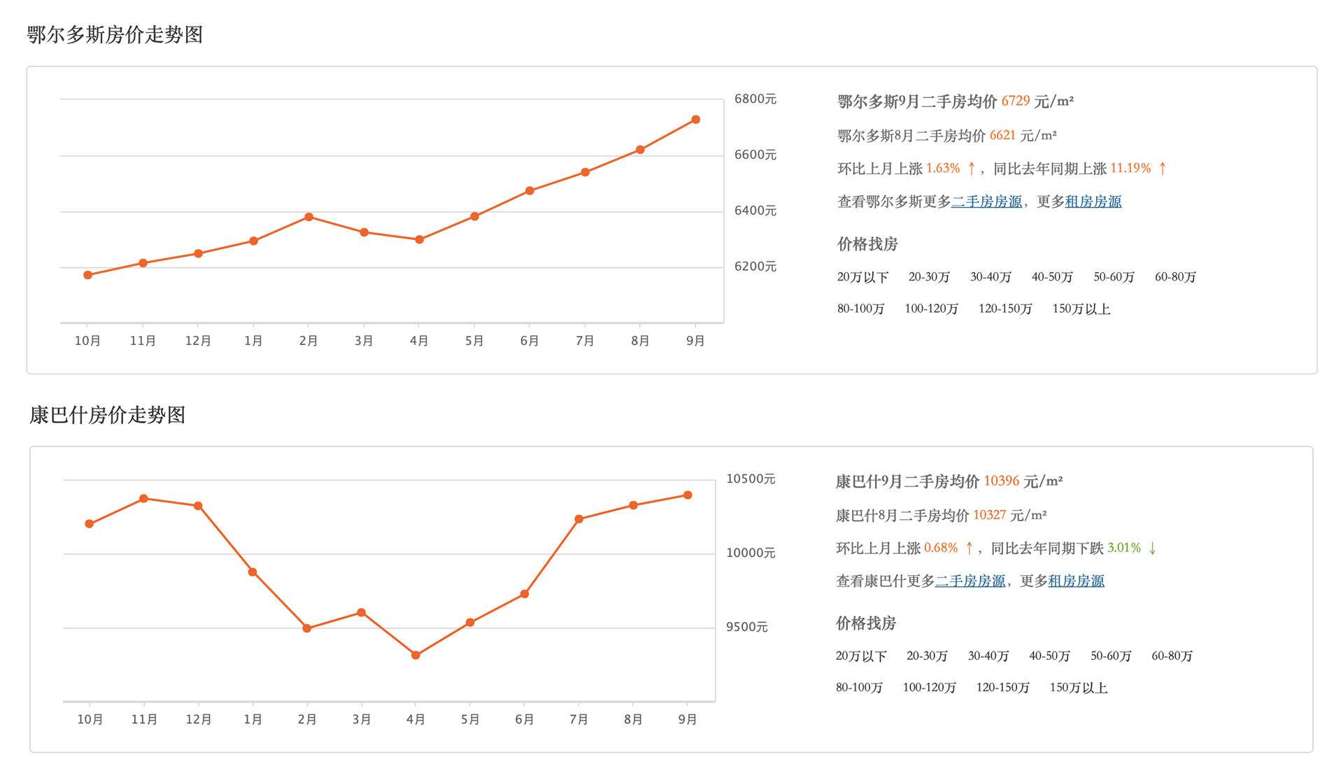 几年过去后,鄂尔多斯已逐渐度过煤炭城市转型的阵痛,房价也逐步恢复到暴跌前的水平。“安居客”的数据显示,鄂尔多斯9月二手房均价为每平方米6729元,环比上涨 1.63%;康巴什区9月二手房均价为每平方米10396元,环比上涨 0.68%。