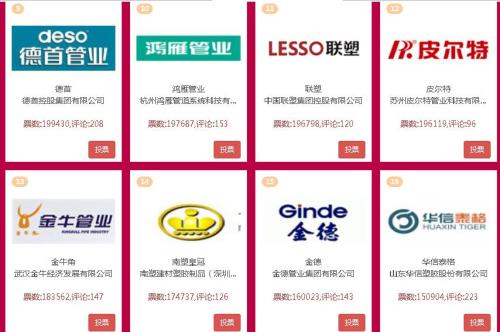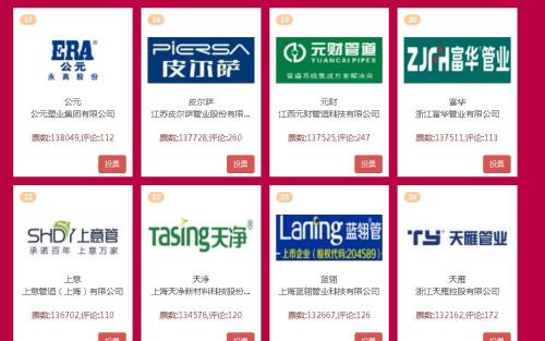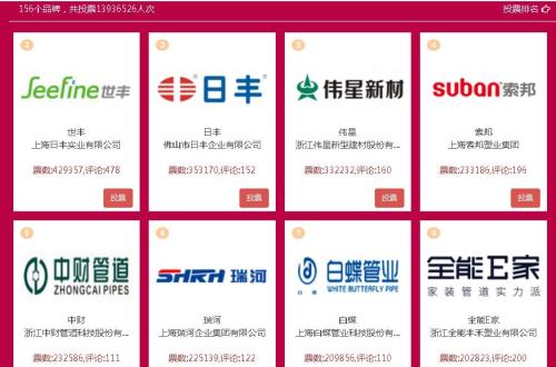 在短短的三个月投票时间,就有一百多个品牌参加,投票总数高达1393万。浏览次数高达1478万次,这次活动活爆到难以想象。由网友、消费者、行业经销商,知名人士火热投票、评论、点评评选活动,世丰,日丰,伟星,索邦,中财,瑞河,白碟,全能E家,德首,鸿雁管业,联塑,皮尔特,皮尔萨,金德,华信泰格,公元,元财,富华,上意,天雁,欧美亚,弗沃德、蓝翎品牌得到消费者一致的好评。