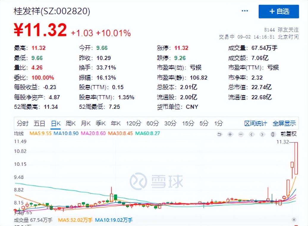 9月2日,“麻花第一股”桂发祥盘中再度涨停,迎来3连板。截至发稿,报11.32元/股,换手率33.71%,成交额7.06亿元。