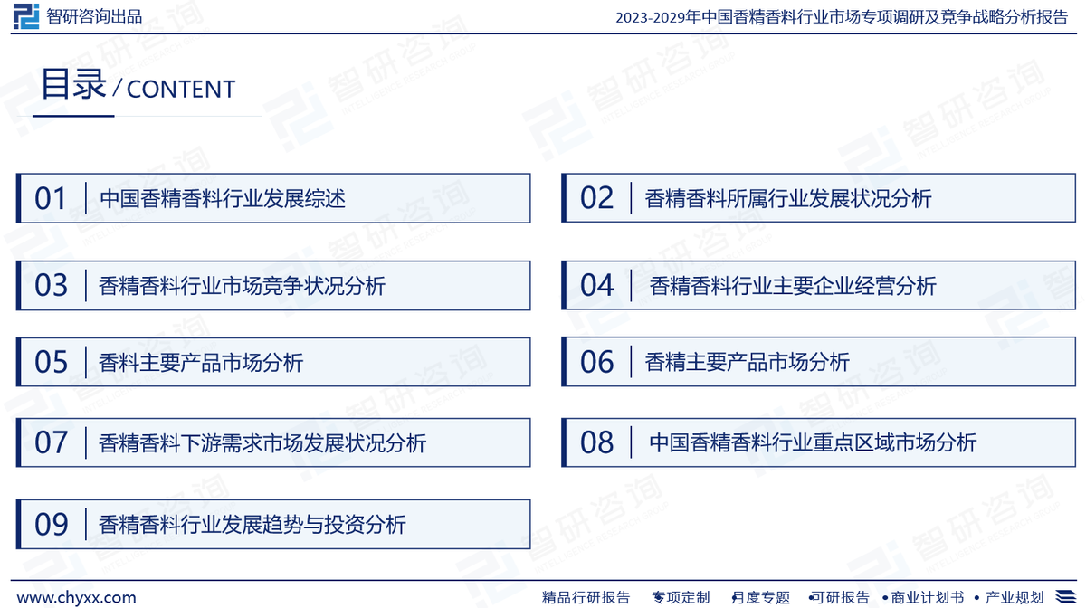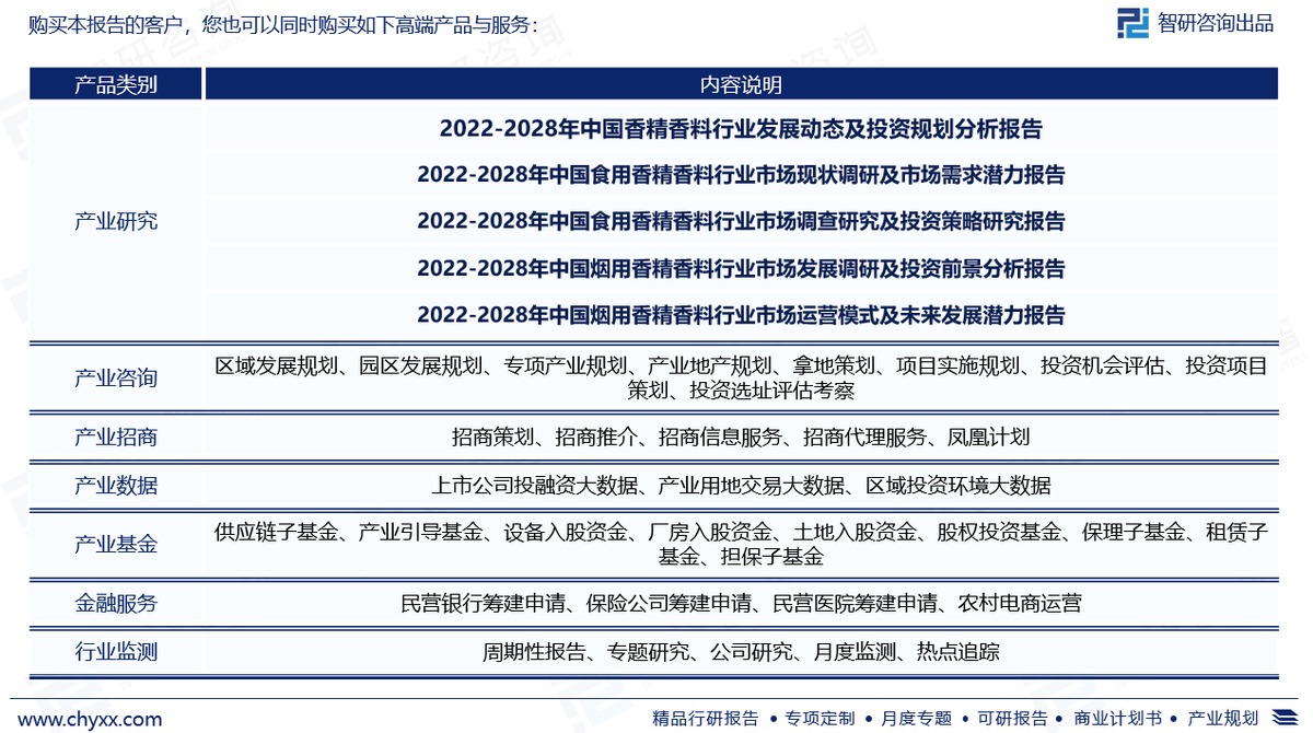是智研咨询重要成果,是智研咨询引领行业变革、寄情行业、践行使命的有力体现,更是香精香料领域从业者把脉行业不可或缺的重要工具。智研咨询已经形成一套完整、立体的智库体系,多年来服务政府、企业、金融机构等,提供科技、咨询、教育、生态、资本等服务。