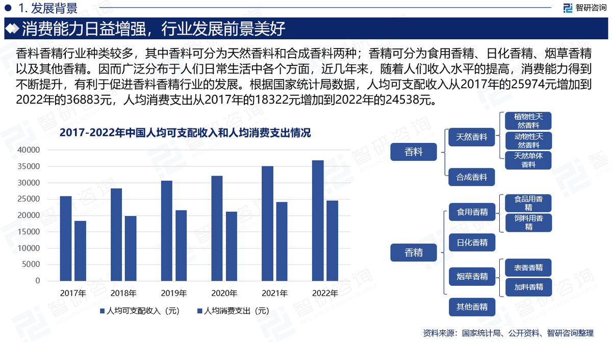 香料香精行业种类较多,其中香料可分为天然香料和合成香料两种;香精可分为食用香精、日化香精、烟草香精以及其他香精。因而广泛分布于人们日常生活中各个方面,近几年来,随着人们收入水平的提高,消费能力得到不断提升,有利于促进香料香精行业的发展。根据国家统计局数据,人均可支配收入从2017年的25974元增加到2022年的36883元,人均消费支出从2017年的18322元增加到2022年的24538元。