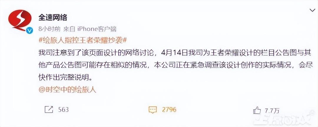 不过《王者荣耀》官方并未对此事做出说明,当天下午自称该图片的供应商的“全速网络”官微表示正在紧急调查该创作的实际情况,并且会尽快做出说明。该事件一时间也是被众多网友关注,热度直接冲上了当时的微博热搜第一。