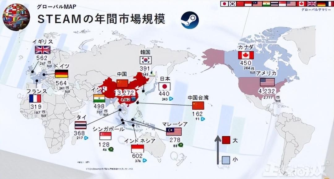 Steam上中国市场收入超过了美日韩欧之和,其中美国仅为4232亿日元排名第二。