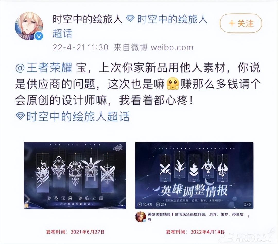 网易旗下游戏《时空中的绘旅人》官微在新发布的微博中直接@腾讯旗下著名手游《王者荣耀》官微,并表示《王者荣耀》近日新的宣传图片中素材涉嫌抄袭《时空中的绘旅人》的图片素材