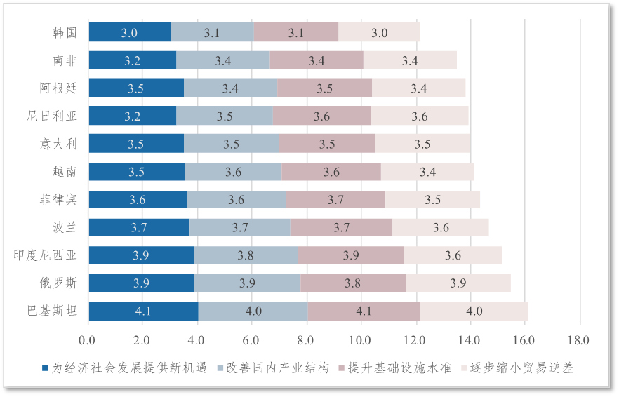 调查结果显示,受访所有“一带一路”参与国公众对该倡议为本国发展带来的影响持积极态度。这些影响涉及经济发展、改善国内产业结构、提升基础设施水准和逐步减少贸易逆差四个方面。其中巴基斯坦、俄罗斯和印度尼西亚公众对此评价最为乐观。