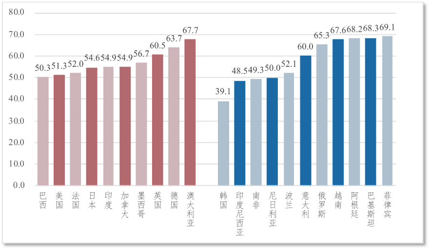 “一带一路”参与国巴基斯坦、俄罗斯、尼日利亚、印度尼西亚、阿根廷、南非、越南、菲律宾及“一带一路”非参与国墨西哥、巴西公众对中国好感度评价较高。西方发达国家及日韩公众对中国好感度普遍偏低。