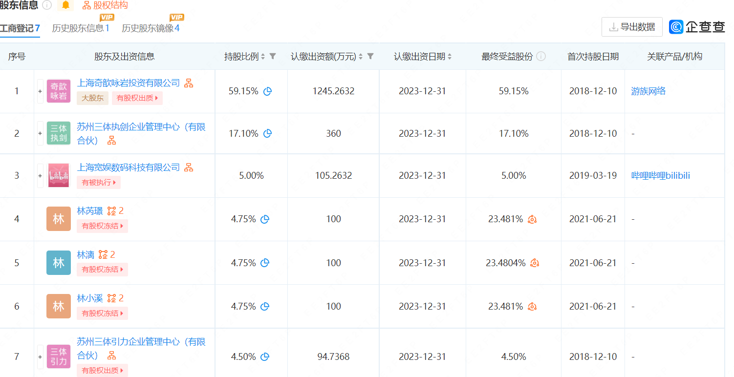 说起“三体宇宙”,是三体宇宙(上海)文化发展有限公司,成立于2018年,而它的大股东则是上海奇歆咏岩投资有限公司,持股59.15%,而它的实际控股公司则是上海游族科技集团有限公司,持股100%,“三体宇宙”在以往都是有游族科技来控股的。