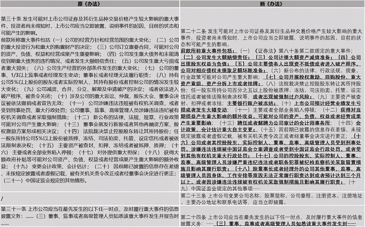 1.《办法》对新《证券法》第八十条第二款已规定的重大事件作了援引规定,并补充完善了其他情形;