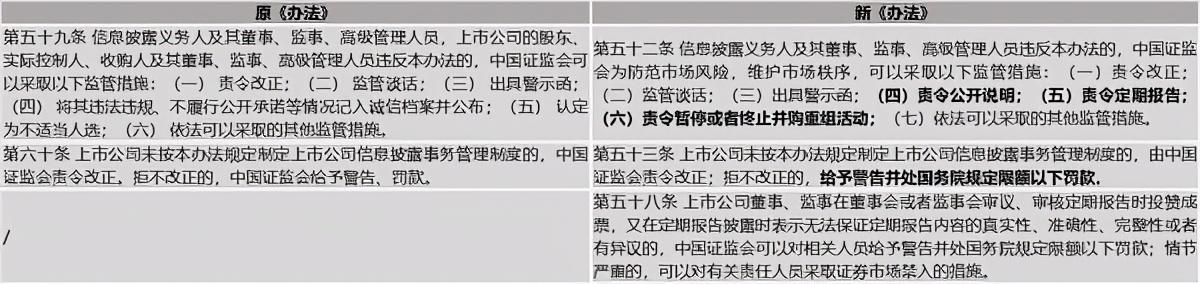 1.为更好地贯彻、落实新《证券法》的违法惩处要求,《办法》此次修订中进一步完善、明确了上市公司监管领域常用的监管措施的类型,如采取责令改正、监管谈话、出具警示函等;
