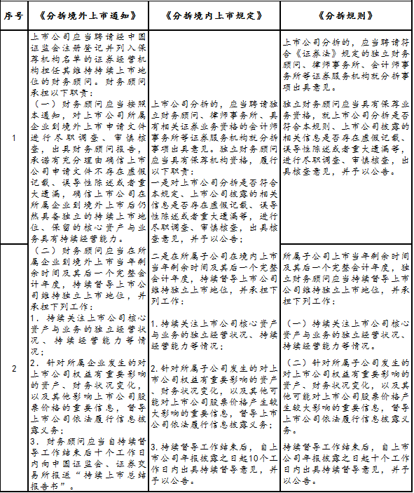 在中介机构的聘请及其服务要求上,《分拆境外上市通知》《分拆境内上市规定》及《分拆规则》规定的内容对比如下: